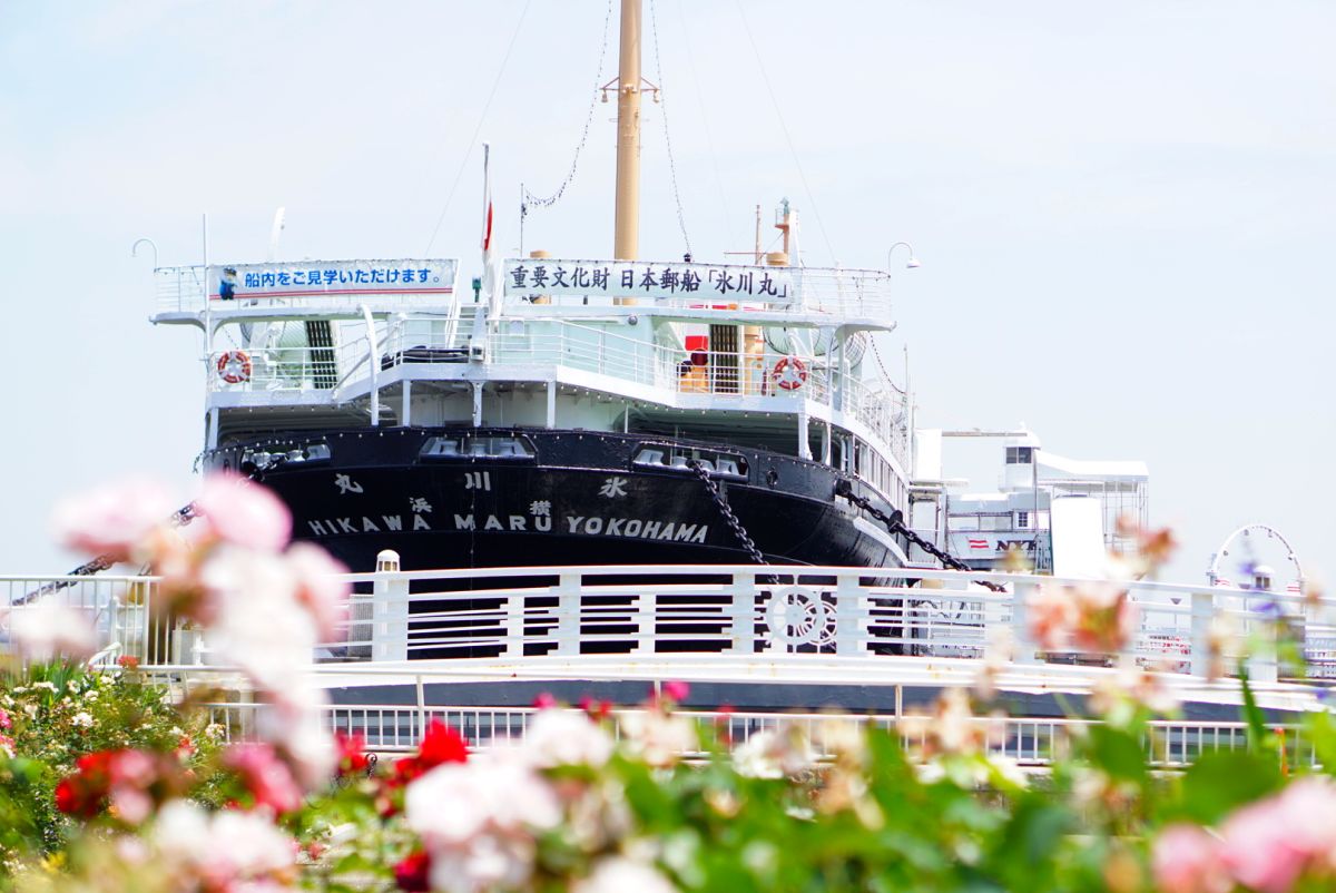 「未来のバラ園」以外にもたくさんのみどころがある山下公園。こちらは日本郵船が昭和5年(1930)にシアトル航路用に建造した「日本郵船氷川丸」。「未来のバラ園」からも見えるので、バラ越しに写真を撮るのもおすすめです。
