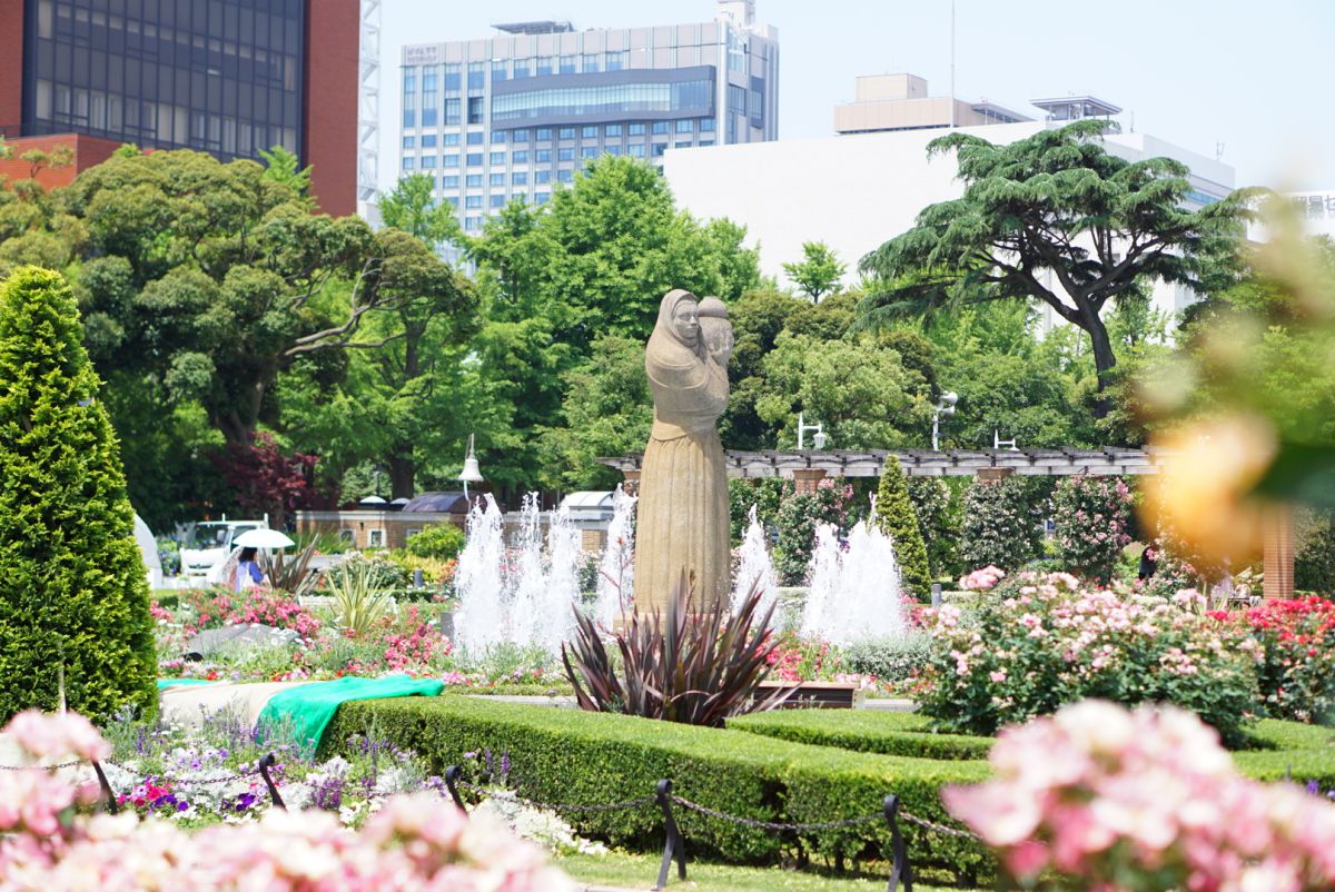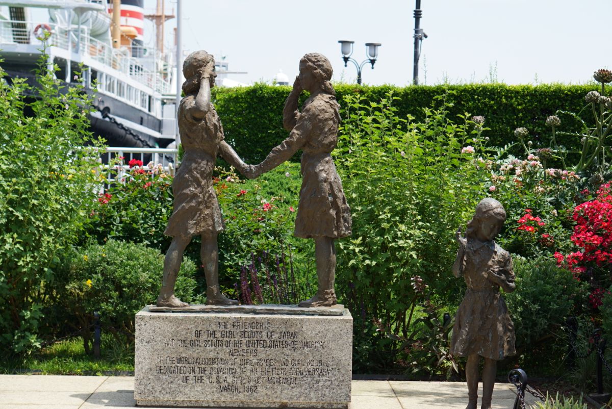 「未来のバラ園」の一角にたたずむこちらの像は、日米ガールスカウト友好碑「やくそく」像。日米友好の記念としてアメリカのガールスカウト50周年とガールスカウト日本連盟の世界連盟加入を記念し、昭和37年(1962)に建てられました。