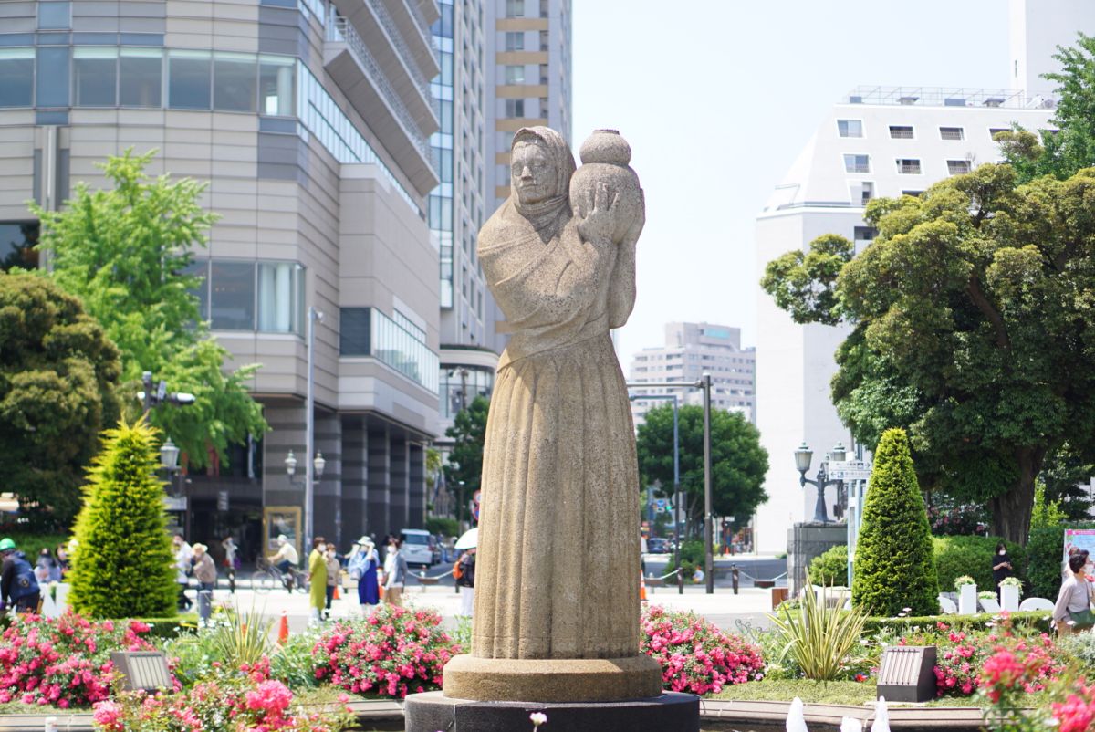 園内のほぼ中央に位置するのは「水の守護神」の噴水。これは、横浜市初となる姉妹都市のサンディエゴ市から寄贈されたもの。昭和35年(1960)に横浜市が「茶室」を寄贈したそのお返しとして、米国西海岸最南端の港町であるサンディエゴ市からこの「水の守護神」が届けられ、山下公園に設置したのだそうです。