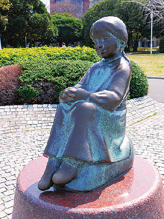 こちらも人気のフォトスポット。童謡『赤い靴』の歌詞をイメージして造られた「赤い靴はいてた女の子像」。