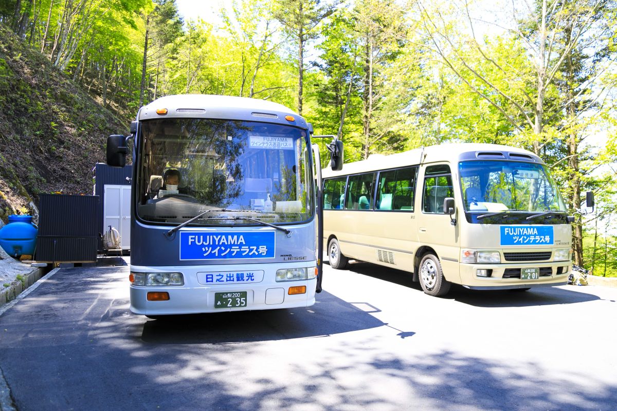 ツインテラスまでは一般車両進入禁止のため(徒歩、自転車は可)、送迎バスで移動します。送迎バスの停留所は、沢妻亭を発着点として全部で4か所あり、それぞれに無料の駐車場があります。送迎バスは、9~15時の間、1時間に1本(土・日曜、祝日は30分に1本)の間隔で運行しているので、ゆっくりテラスを満喫できます。乗車料金は小学生以上片道200円。※釣り銭のないように小銭をご用意ください。(1回の乗車で最大20名まで乗車可)