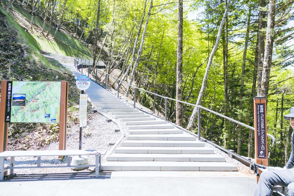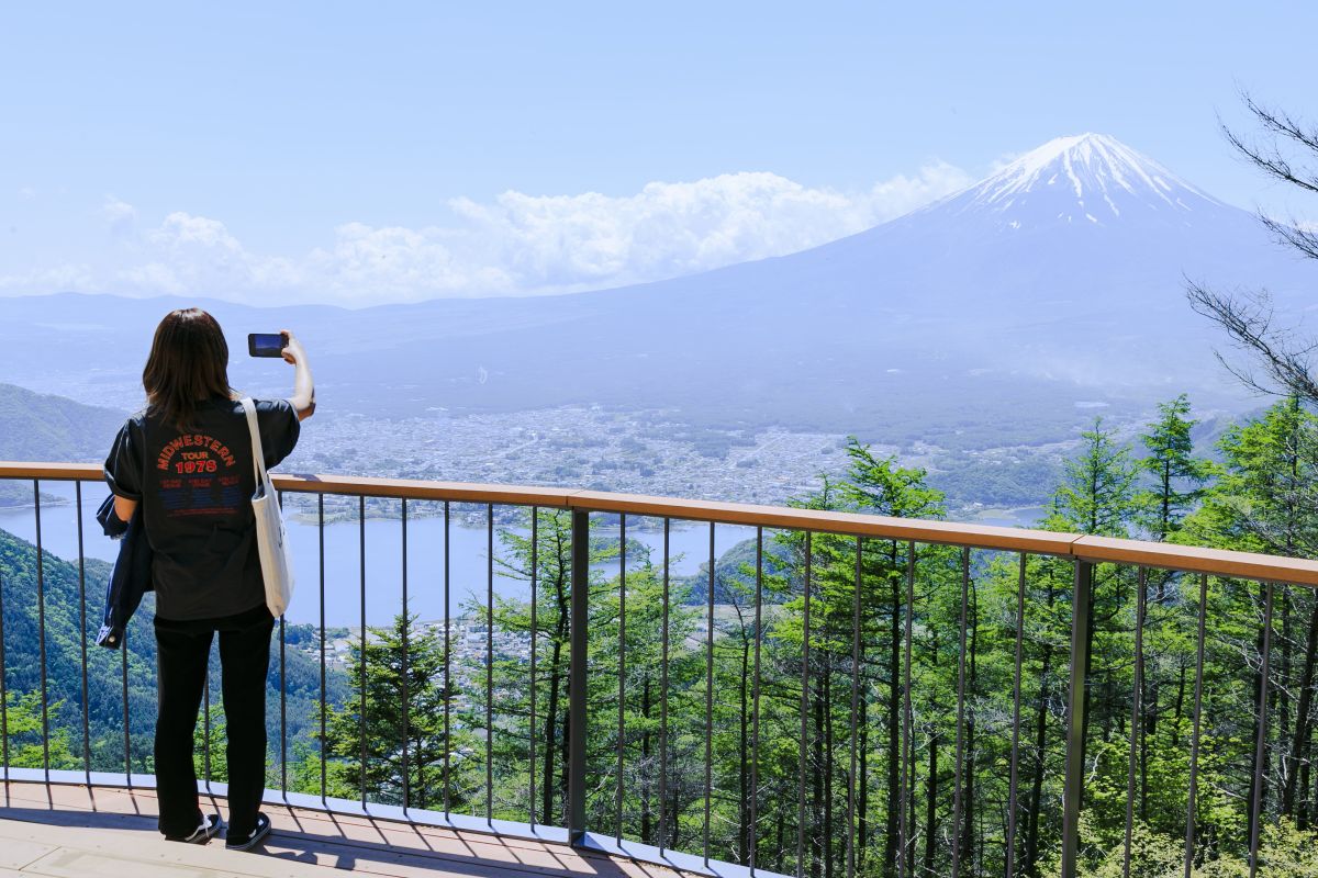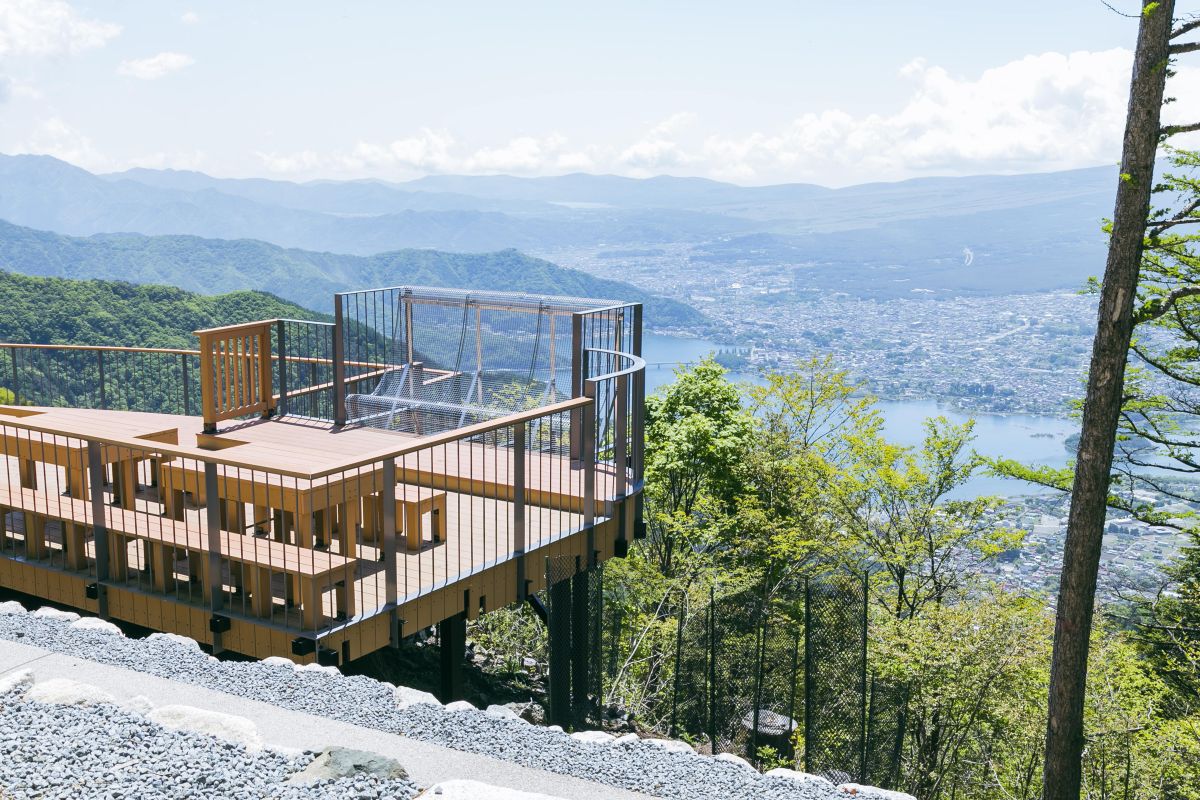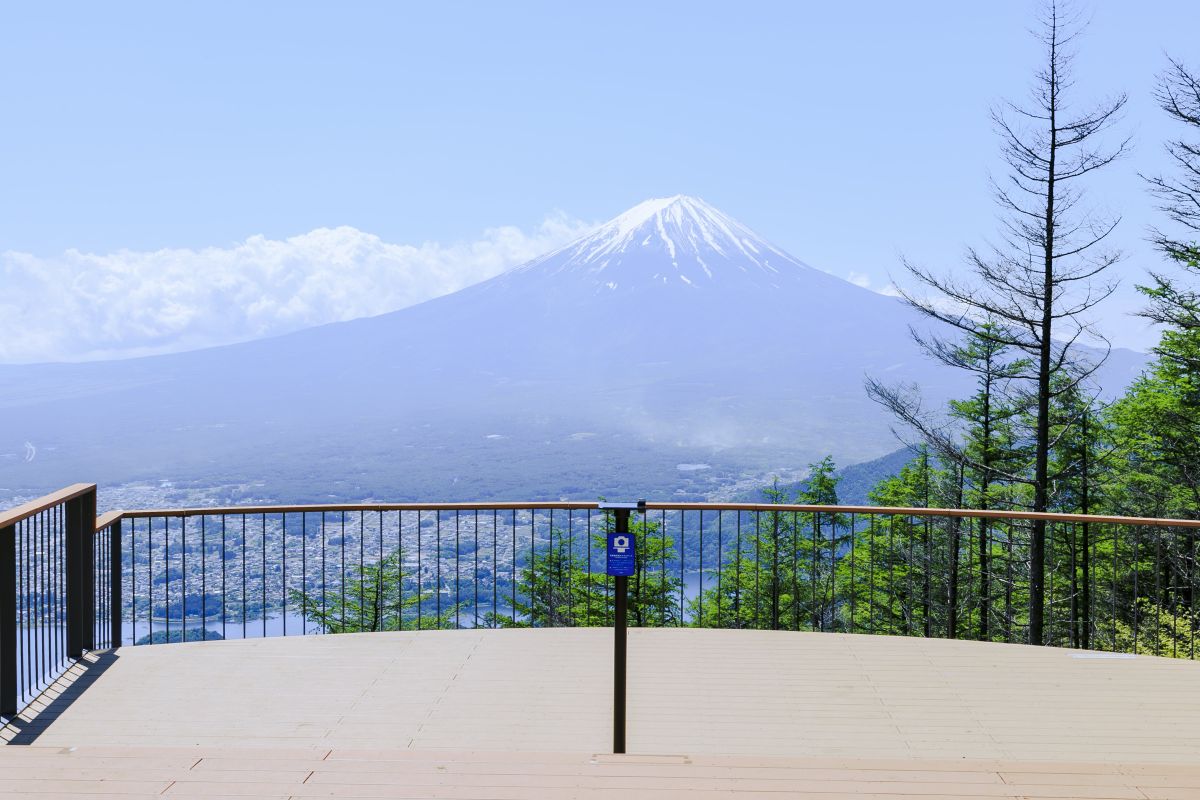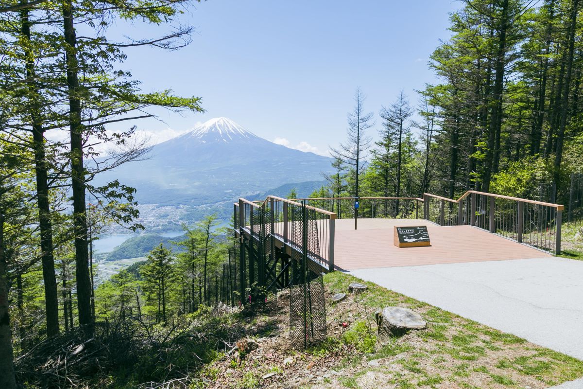 階段を登った先に最初に現れるのはセカンドテラス。もともとは新道峠展望台と呼ばれ、目の前に富士山を眺めることができることからビューポイントとして以前から多くのカメラマンや登山家を魅了する人気のスポットでした。河口湖の北に連なる御坂山塊(みさかさんかい)の峠のひとつとして見渡す限りの大パノラマに思わず歓声があがります。