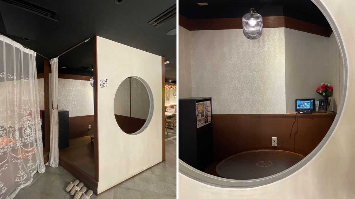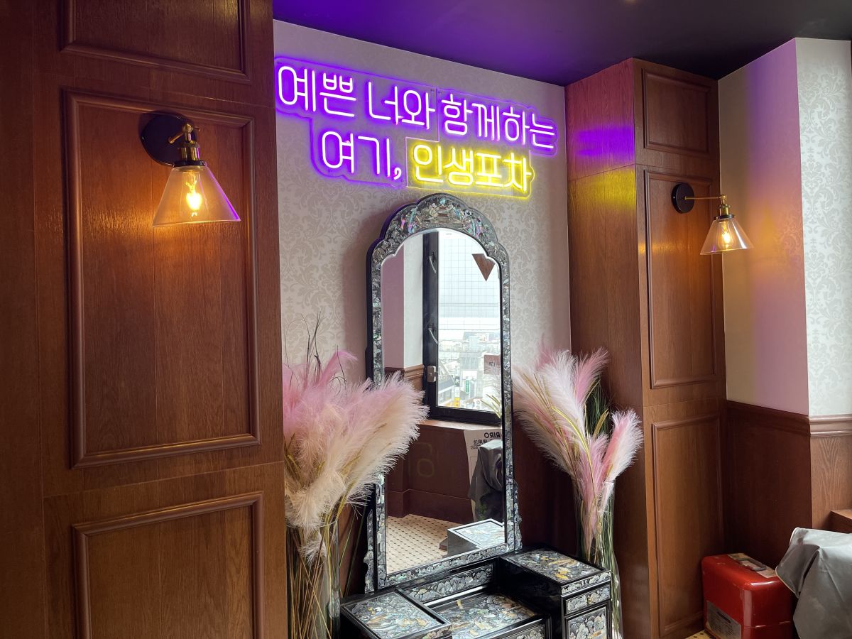 韓国式の庇のついた入り口や奥に見えるシャンデリアが、韓国レトロな世界観を演出しています。
