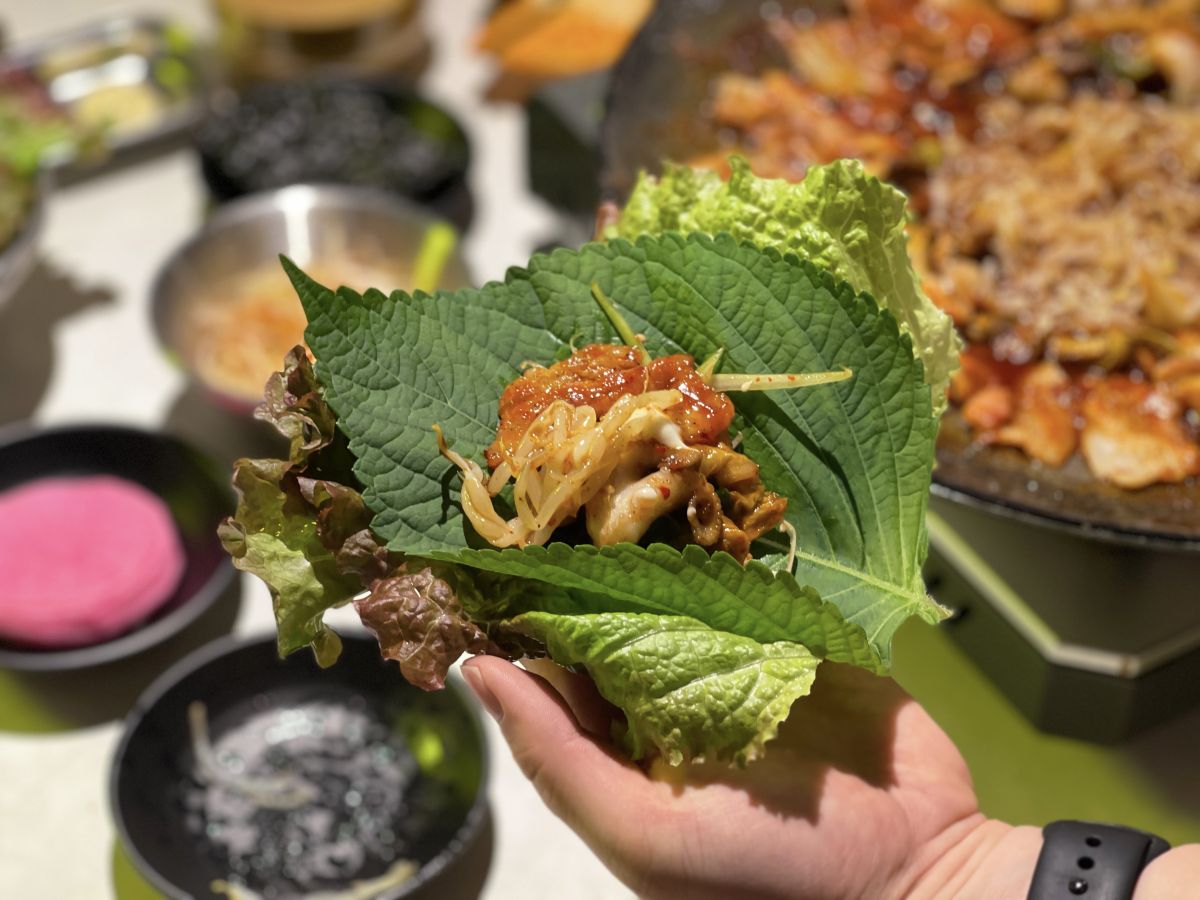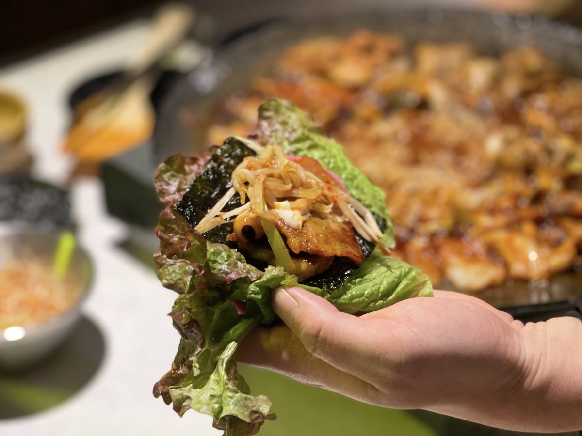 野菜に、炒めたイイダコ・サムギョプサルをのせて包み、お好みで薬味をつけて食べるのが韓国式。今回は、お店おすすめの包み方を2種類教えてもらいました。