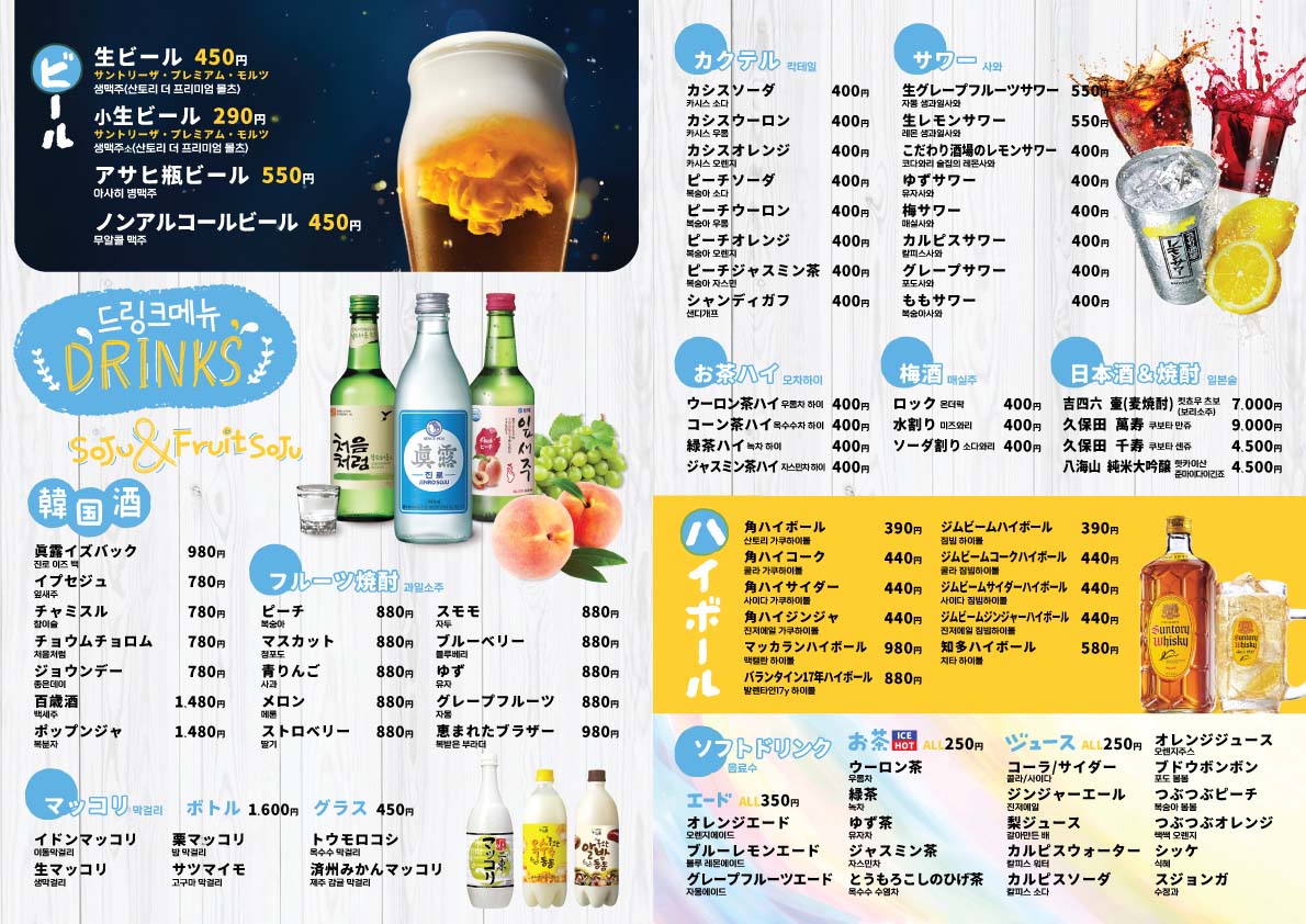 ソフトドリンクは、「とうもろこしのひげ茶」や「エード」など、韓国で定番のラインナップ! アルコール類も現地のお店のような品揃えで、マッコリだけでも種類が豊富です!