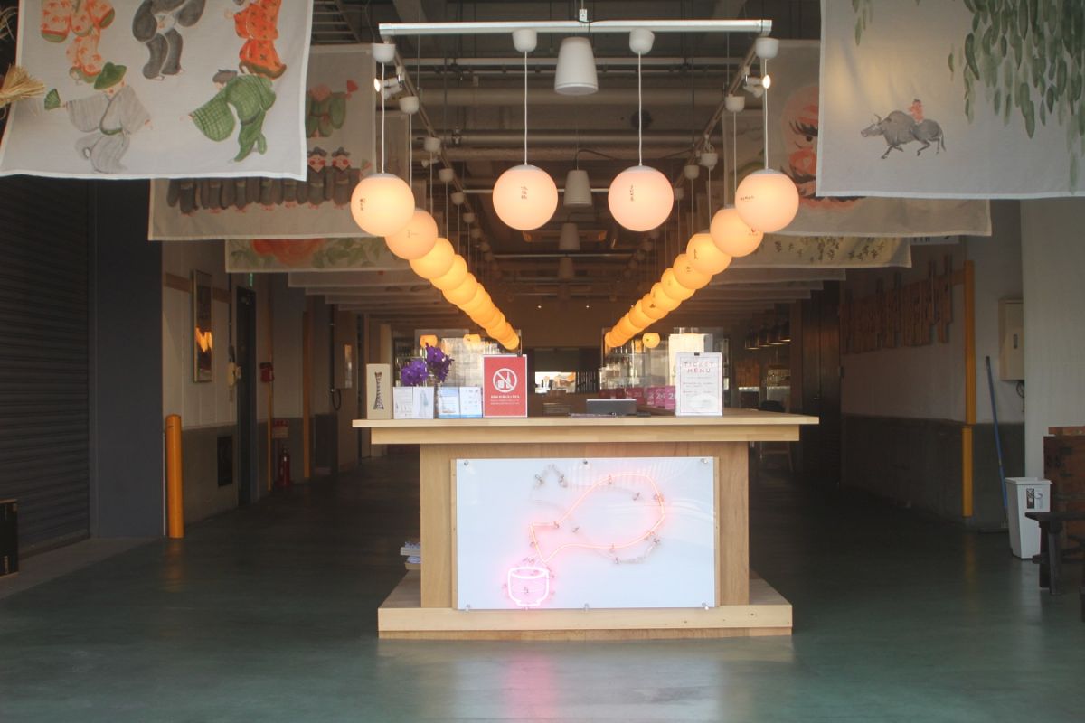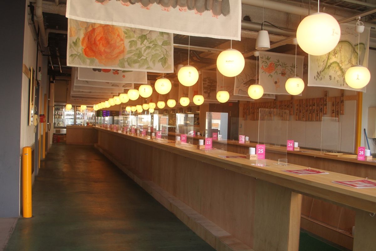 参道をイメージした「コの字カウンター」は、全長50mという驚きの長さです。接客するスタッフは法被(はっぴ)を着てお客さんをお出迎え。祭りのような雰囲気にワクワク感が増します。