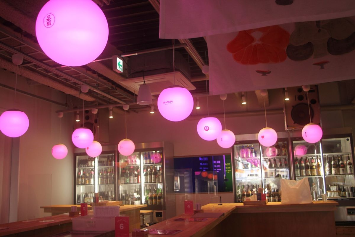 夜になるとカウンターの上部をぐるりと囲む提灯の色が変化するのも、とってもオシャレ。