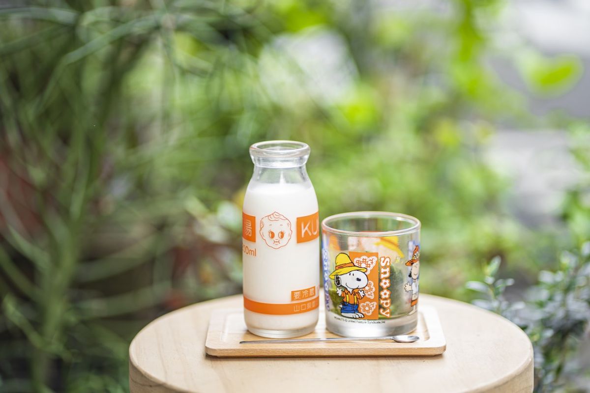 「小山園濃抹茶拿鐵(NT$160)」。昔懐かしの牛乳瓶とアンティークグラスがかわゆし♪