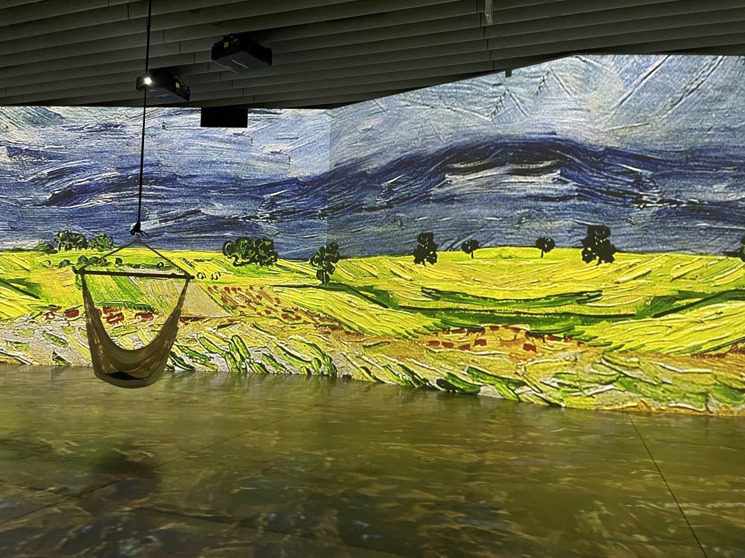私は写真のハンモックに揺られて鑑賞しました。揺れながら見ることによって、音楽とゴッホの作品群に集中でき、ゴッホの世界に迷い込んでしまいそうでした。