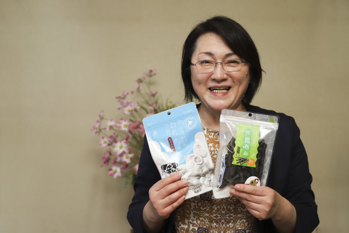 「まきまき昆布」には北海道産棹前(さおまえ)昆布の一等級だけを使用し、採れたてを浜で天日干し。「添加物を使わず、天然の素材で味付けしているので、後味のよさも自慢です」と山下文子さん。