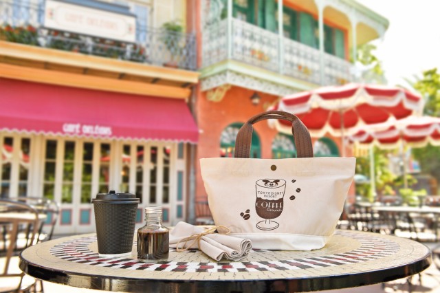 パークのレストランで提供している、コーヒーの豆かすから抽出した染料で色をつけた生地を一部使用。ミッキーのラテアートを施したドリンクのイラストもかわいい!