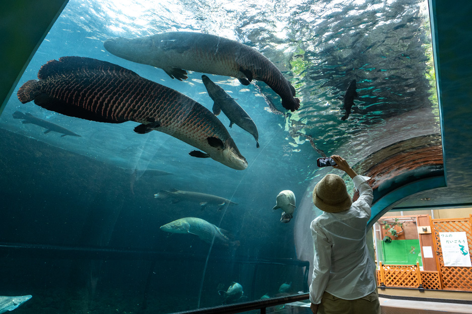 ランチの後は、隣接するおさかな館の見学タイム。ここには幻の大魚アカメなど、四万十川をはじめとする淡水魚が勢揃いしています。身近なカエルやカメもいるので、子どもの自由研究の課題探しにもピッタリ。見学コースの終盤に登場する世界最大級の淡水魚ピラルクは、その大きさと美しさ、優雅な泳ぎに圧倒されますよ!