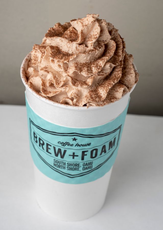 エスプレッソとカカオソースの上にスチームミルクとチョコレート・ココナッツ・ホイップクリームをのせた、お店のベストセラー商品「ハウピア・モカ(12oz)」$7。ホットの他、プラス$1でアイスブレンドにもできます。