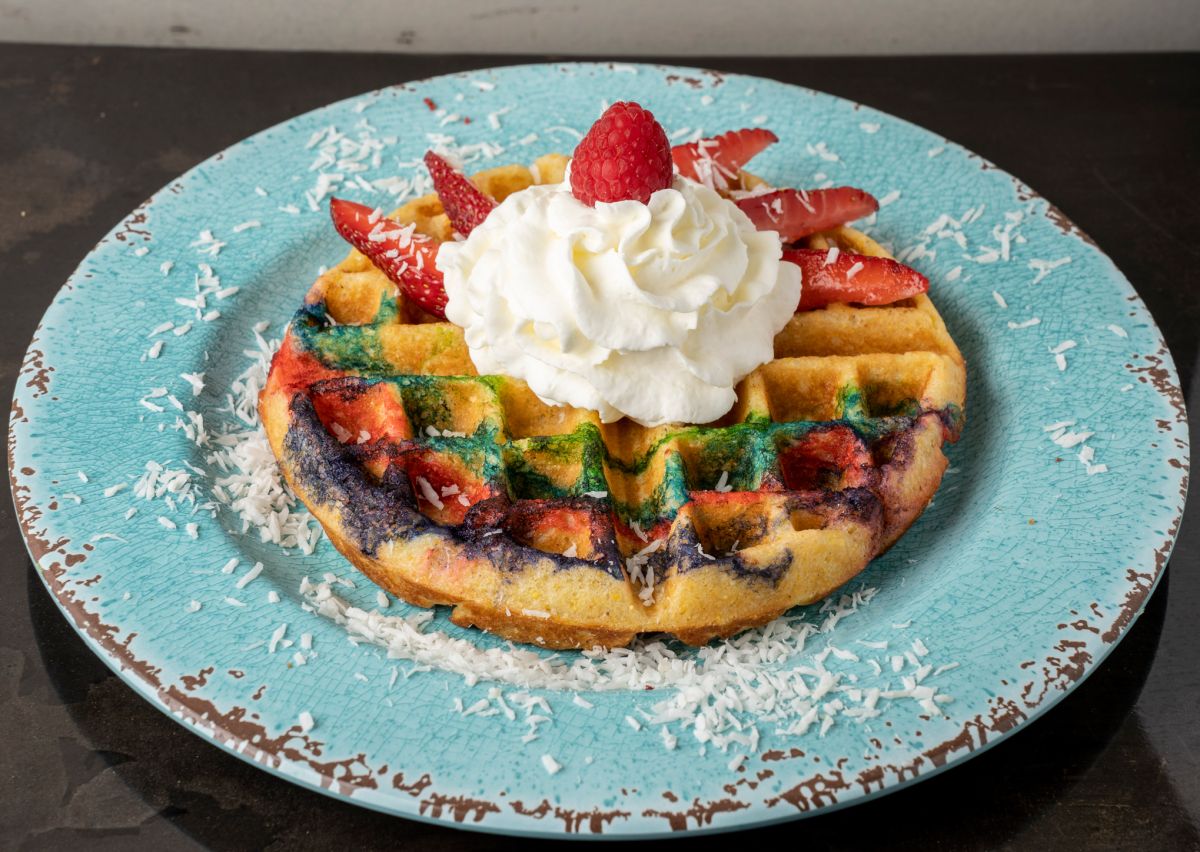 「ブリュー+フォーム」は、フードやスイーツのメニューも充実しています。新作メニューの「パラダイス・ベルギー・ワッフル」$12.50は、ワッフルの上にレインボーシュガーとホイップクリーム、いちご、ココナッツフレークがかかったハワイらしい一品。表面がカリッ!中がフワっとしたワッフルはやみつきになる美味しさです。