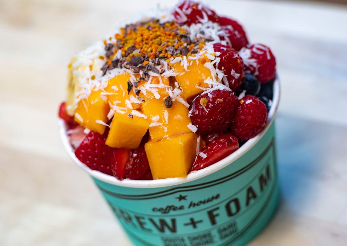 こちらは、フルーツもりもりの「アサイ・アバランチ」$16.50。「アバランチ」とは、雪崩を意味する英語で、文字通りイチゴやパパイヤ、ブルーベリーなどのフルーツが、雪崩のように、溢れんばかりに盛られています。フルーツの上には、カカオニブやはちみつと花粉を混ぜ固めたピーポーレン、ココナッツ・チア・グラノーラがのっていて、食感も楽しい!シロップは、はちみつかアガベシロップからチョイスできます。