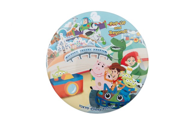 ポップアップブックとトイ・ストーリの仲間たちがデザインされたキービジュアルが缶バッジに。