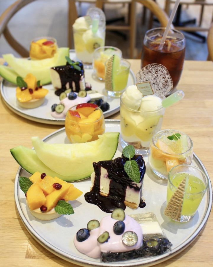 1つのお皿に盛られたアフタヌーンティーには、メロンをメインに、マンゴーやブルーベリーなどの季節のフルーツがふんだんに使われています。