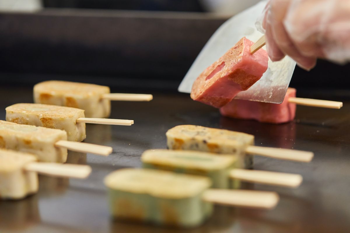 鉄板の上で約5分、注文が入ってから焼き始めます。表面はカリッと、なかにはじんわりと熱がとおるように。温度はその日の気温や、生麩の状態に合わせて絶妙なさじ加減で調整します。