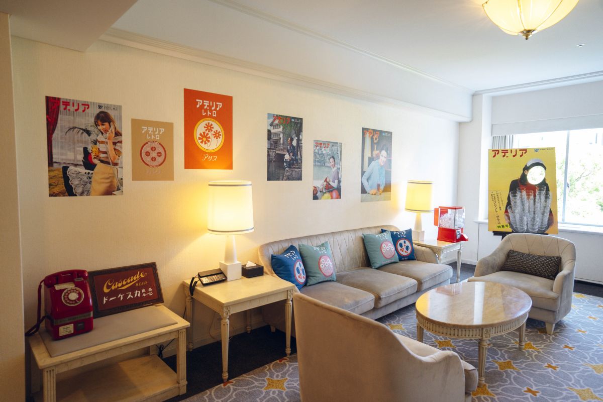 昭和39年(1964)に開業した東京プリンスホテル。「IN ROOM Retro“泊まれる純喫茶”」は、開業当時のクラシカルな雰囲気を残すプリンセススイートルームを、昭和テイスト漂う「アデリアレトロ」デザインのポスターやクッションなどで飾った部屋に宿泊するプランです。