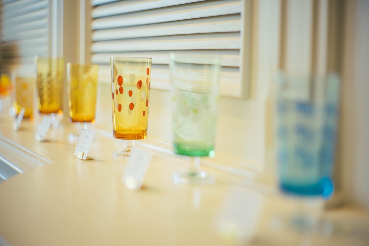 「アデリアレトロ」とは、食器の老舗メーカー「石塚硝子」のブランドシリーズ名で、昭和の家庭で使われていた「アデリア」のグラスウェアを、現代でも安心して使えるようにリメイクした製品です。花や動物などかわいらしい柄をあしらったプリントグラスは、温かみがあり、今ではかえって新鮮に感じられます。お部屋には、そのヴィンテージグラスが展示され、ソファにはグラスと同柄のクッションがあり、ほのぼのとなごめる雰囲気になっています。