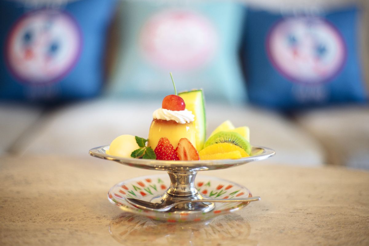 今回のプランでは、お部屋で純喫茶の王道的メニュー、プリン ア・ラ・モードや、「マカリオソーダ」が味わえるのが特典のひとつです。ホテル特製のプリン ア・ラ・モードは、フルーツやクリームで飾られて、おいしいのはもちろん、とってもフォトジェニック! イタリアの炭酸ジュース「マカリオソーダ」は、レトロタッチのラベルがキュートで、その味わいもどこかクラシック。「アデリアレトロ」のグラスに注いで楽しみましょう。これらの代金は宿泊費に含まれています。提供時間は15時~17時30分の間で、予約時に時間をセレクトします。