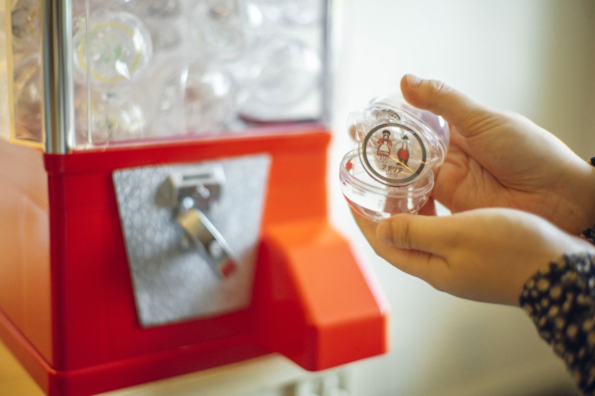 お部屋に設えられたカプセルトイのマシーンには、心が弾みます。専用メダルを入れ、ハンドルを回すと出てくるのは「アデリアレトロ」オリジナルのアクリルキーホルダー。全12種類の柄のなかから、どの柄が出てくるかは、カプセルを開けてからのお楽しみ。
