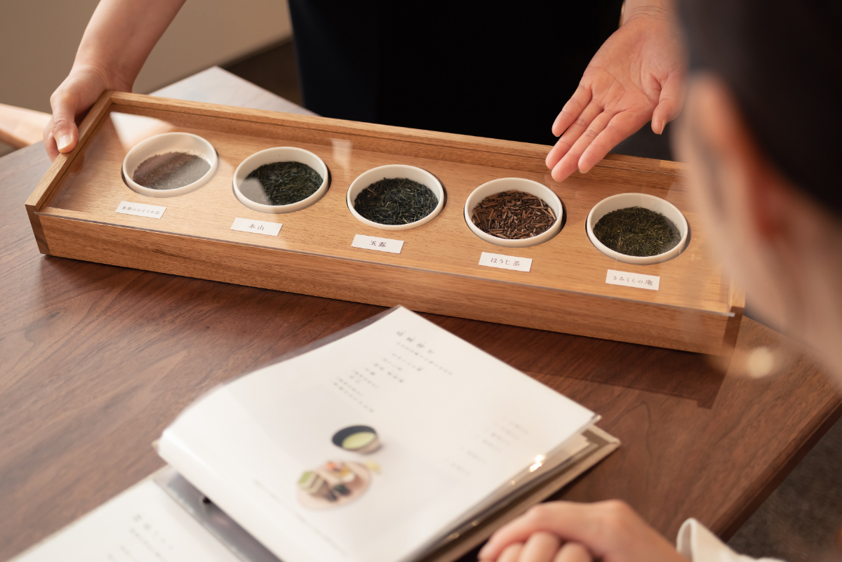 セットに付くお茶は、煎茶やほうじ茶、抹茶などがラインナップされており、それぞれの茶葉の香りや味わいの説明を受けてから選ぶことができます。迷ったら、スタッフの方の力を借りてみて。自分の好みを伝えたり、スイーツに相性の良い茶葉を聞いてみましょう。