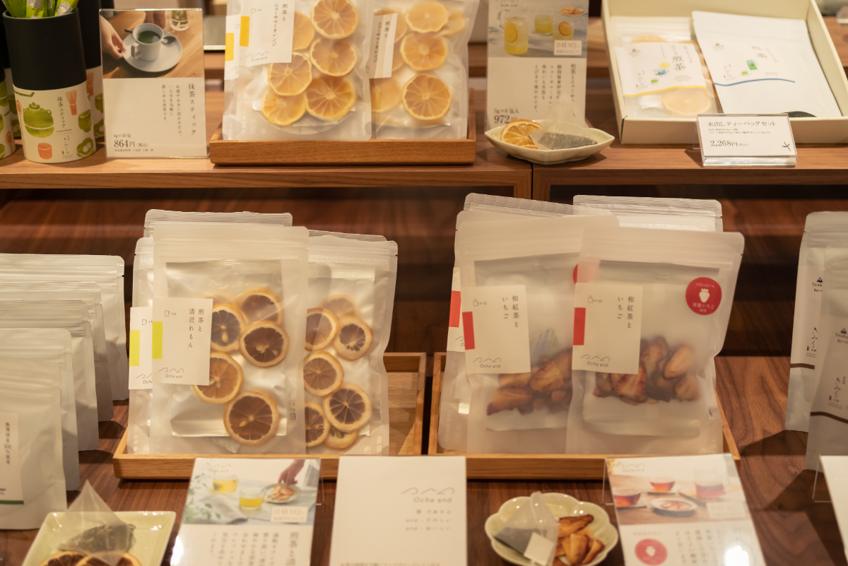 お茶スイーツを堪能した後は、改めて、たくさんの商品が並ぶショップへ。茶寮でいただいたお茶の購入はもちろん、ギフトに選びたくなるような品の数々が目を引きます。