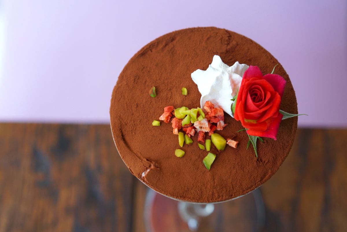 ビターなココアパウダーと、さわやかな酸味のローズ、フランボワーズ、やさしい甘さのクリームのバランスが絶妙で、見た目のインパクトに負けないおいしさ。ひとりで食べきるのにもちょうどいいサイズで、ランチ後のスイーツとしてもぴったりです。