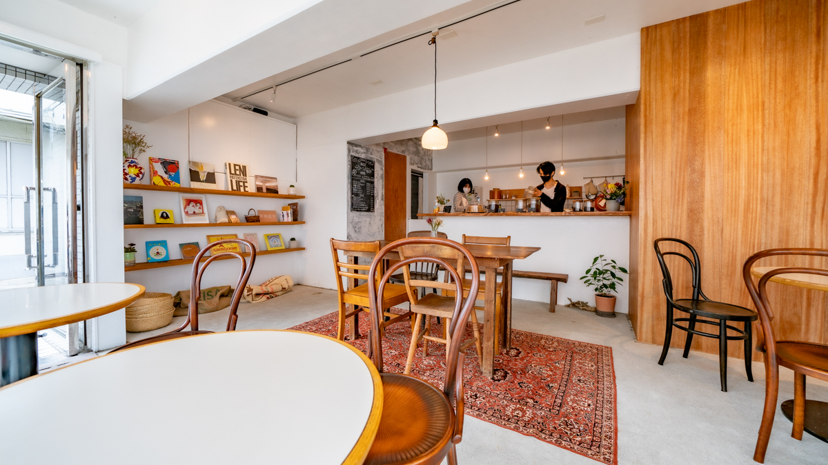 「北欧モダンとミッドセンチュリー」をテーマとした店内は、すべて建築士をしていたご主人が手がけたもの。アメリカやイギリスなどのアンティーク家具を取り入れて、居心地のよい雰囲気を演出しています。