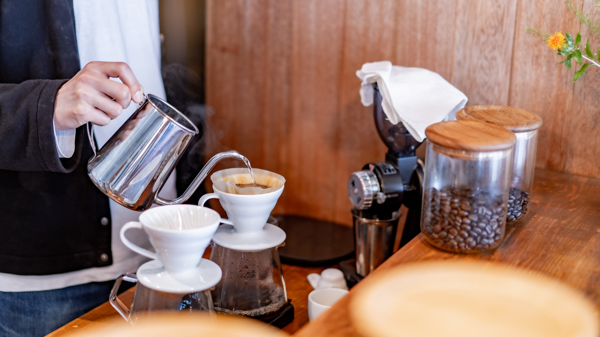 早朝の忙しい時間帯でも、オーダーされた1杯ごとに店主がハンドドリップでコーヒーをおいしく抽出してくれます。ふっくらと膨らむ豆、ペーパーフィルターを濡らさないよう「の」の字を描きながら、丁寧な手つきでお湯を注いでいました。