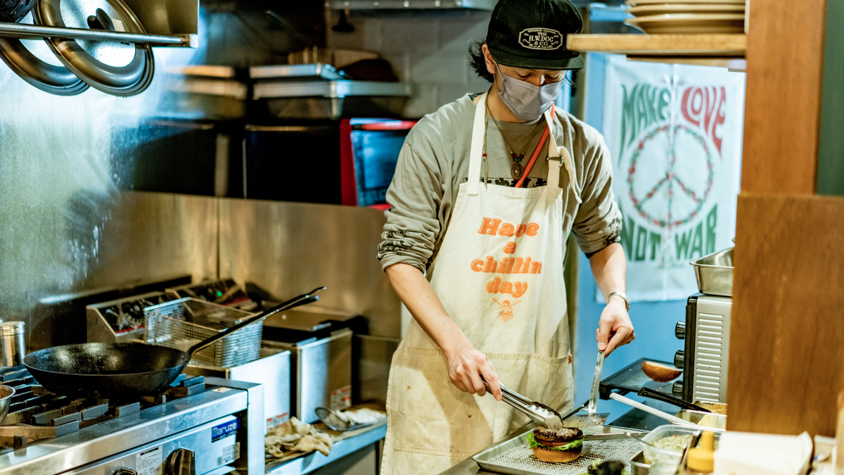 その国境の枠を越えた自由な発想は、お店の看板メニューであるハンバーガー作りにも生かされています。基本的な味付けは自家製バーベキューソースなのですが、具材は実に多国籍。味噌を使用した和風のもの、角煮を使用した中国風のもの、メキシコとイタリアの要素を融合させたメキシカンボロネーゼなるメニューまでラインナップされていました。
