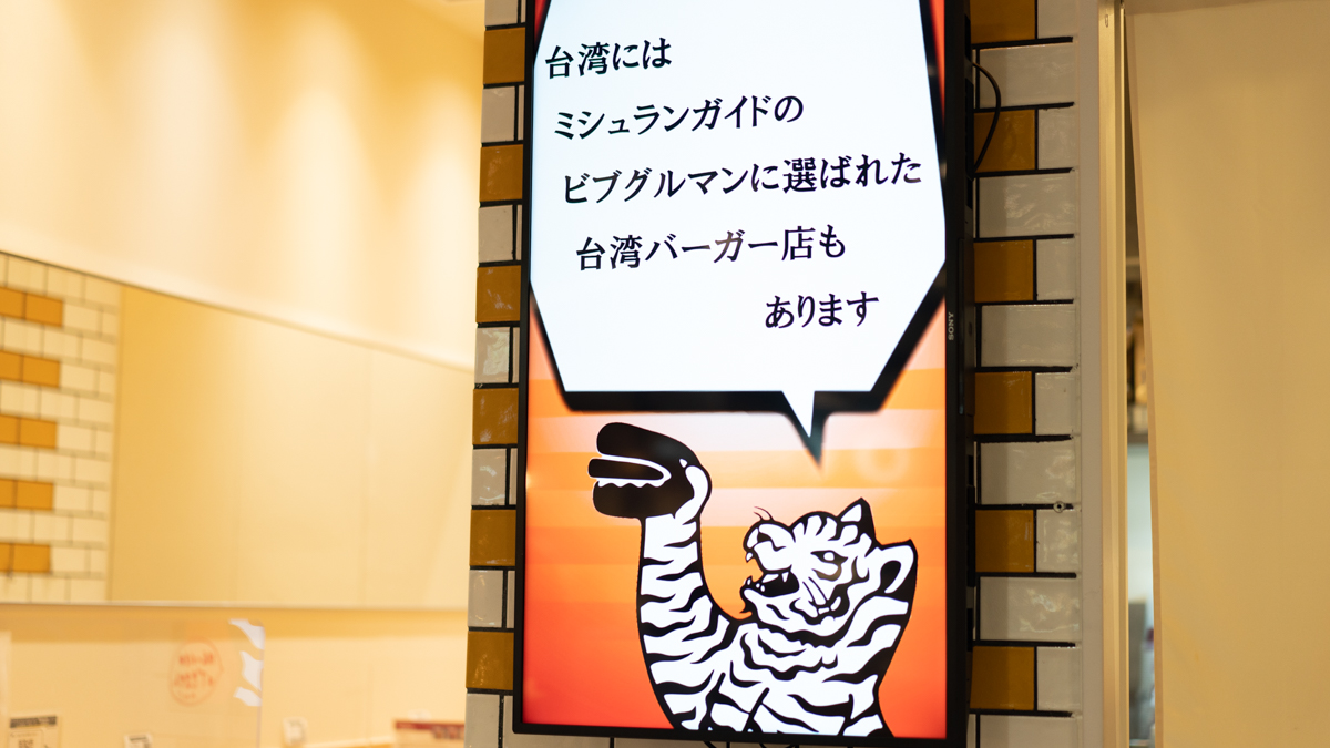ちなみにお店のシンボルであるトラのキャラクターは、店名同様「バオガー」という名前。こちらはバーガーとタイガーを融合させた造語だそう。また台湾バーガーには 「虎咬豬」(トラに噛まれたブタ)という呼び方もあるとか。そう言われてみるとバオズ(包子)の形状は、トラの口にも見えてくるものです。大きな液晶画面にも登場する「バオガー」は、そんな豆知識も多彩に披露してくれますよ。台湾の食カルチャーを満喫するなら、いろいろ盛りだくさんの「バオガー 銀座店」がおすすめです!