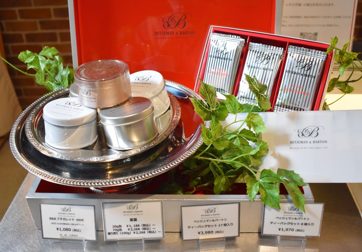 「BETJEMAN & BARTON」のギャラリーで購入できる紅茶は、ルースリーフ20g缶1188円~(写真手前左・白缶)、70g缶2268円~、量り売り100g2268円~や、ティーバッグセット8個入り1970円~(写真左奥)など。