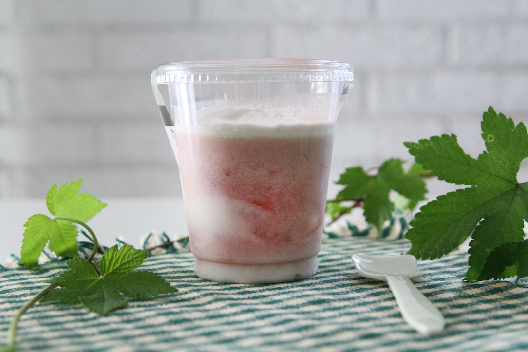 今回発売された「葛シェイク いちご」は、高さ約8.5センチの円筒形の透明カップに入っていて、横から見ると白と淡いピンクが入り混じったマーブル模様。フタはイチゴ感漂うピンクとグリーンの色が施され、ミルクにINするイチゴのイラストが描かれた、ほのぼのとしたデザインです。