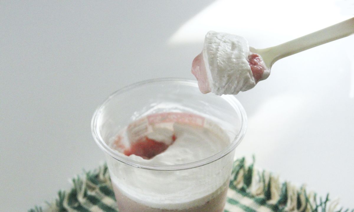 スプーンを差し込んで、ホイップクリームとその下のピンクの層を一緒にすくいとります。口溶けなめらかなで甘さ控えめのホイップクリームと、“ふるふる”とやわらかく、甘酸っぱいイチゴゼリーが混じり合ったやさしい味わい。ミルク感たっぷりのホイップクリームとイチゴの相性は、間違いナシ!と改めて納得です。