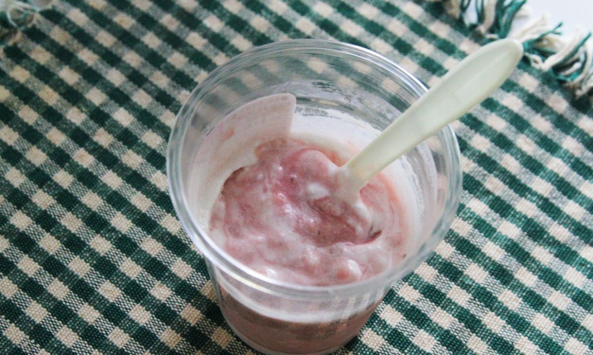 食べ進めると濃厚でぷつぷつと果肉感のあるイチゴソースが混じり始め、イチゴゼリーの風味をアップします。中層から下にかけては、白く“とろん”とした食感のミルクゼリーが登場。ピンクのイチゴゼリーより、少し粘度が高く、これがミルク葛ゼリーのようです。