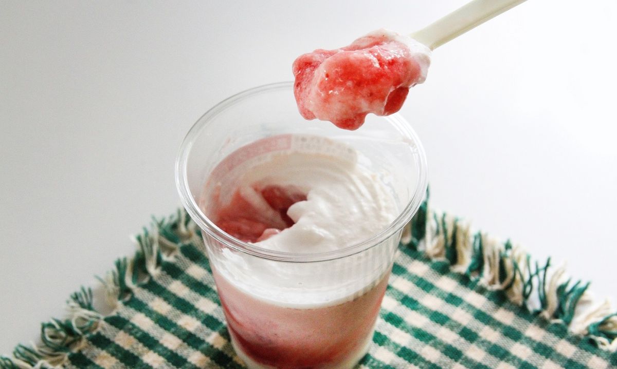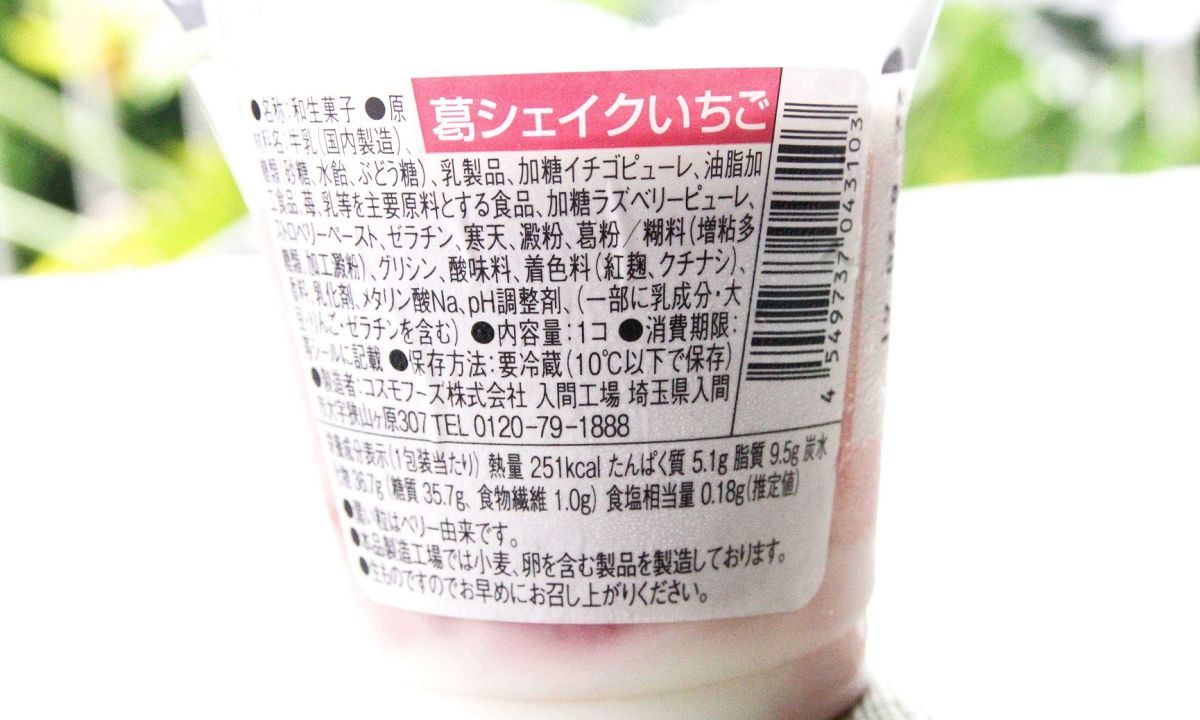 シェイクと名付けられているので、最後はスプーンでぐるぐると混ぜて食べてみます。カップの中全体がマーブル模様になり、イチゴとミルクがボーダレスに。食べ物と飲み物の中間といった感じになりますが、混ぜることで一層まろやかに。全体的に甘さ控えめで、後味はスッキリ。よく冷やして、夏のクールダウンのひとときに味わいたいおやつです。