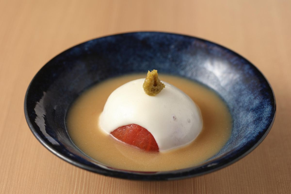 名物メニューのひとつが酒粕おでん。五種のだしと純米酒粕をあわせた特製だしで、野菜やひろうす、ちくわなどをじっくり炊いています。種類もいろいろありますが、人気は「丸ごとトマト」649円。旨みたっぷりのだしで炊かれたトマトに、チーズがとろける魅惑の一品です。