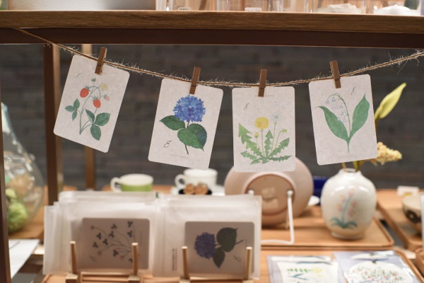 こちらは、琵琶湖のそばのアトリエでつくられている「encle d' encle 〜アンクルダンクル〜」のペーパーアイテム。植物モチーフや優しい色づかいを見ていると、大切な人に何か贈りたくなりますね。花を描いた薄いペーパーが30枚入っている、「ボタニカルペーパー」396円など。