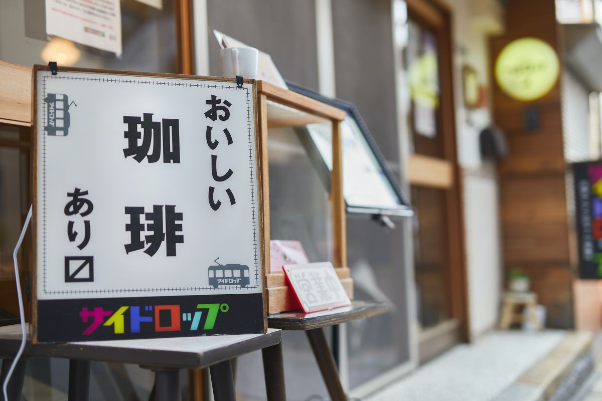 「喫茶とアンティーク雑貨 サイドロップ」があるのは阪急西院駅北改札口から徒歩1分の場所。駅の南で、西大路通の西側は飲み屋街として栄えていますが、大通りを挟んで東側には、下町情緒あふれる風景が広がっています。