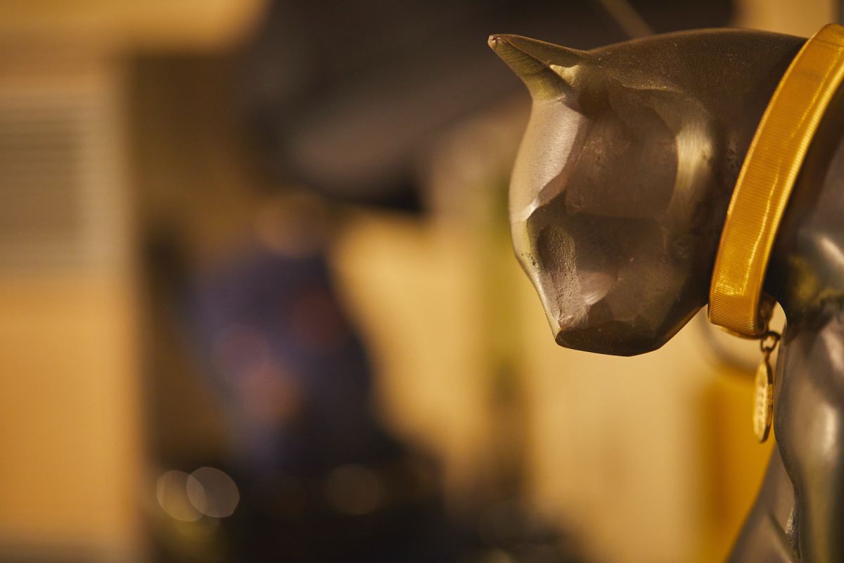 ずばり、こちらにいる看板猫アメちゃんの写真です。アメちゃんは、いろんな雑誌やテレビに登場する人気者。堂々とした立ち居振る舞いで、カメラマンを魅了します。普段は2階の部屋でおやすみ中。