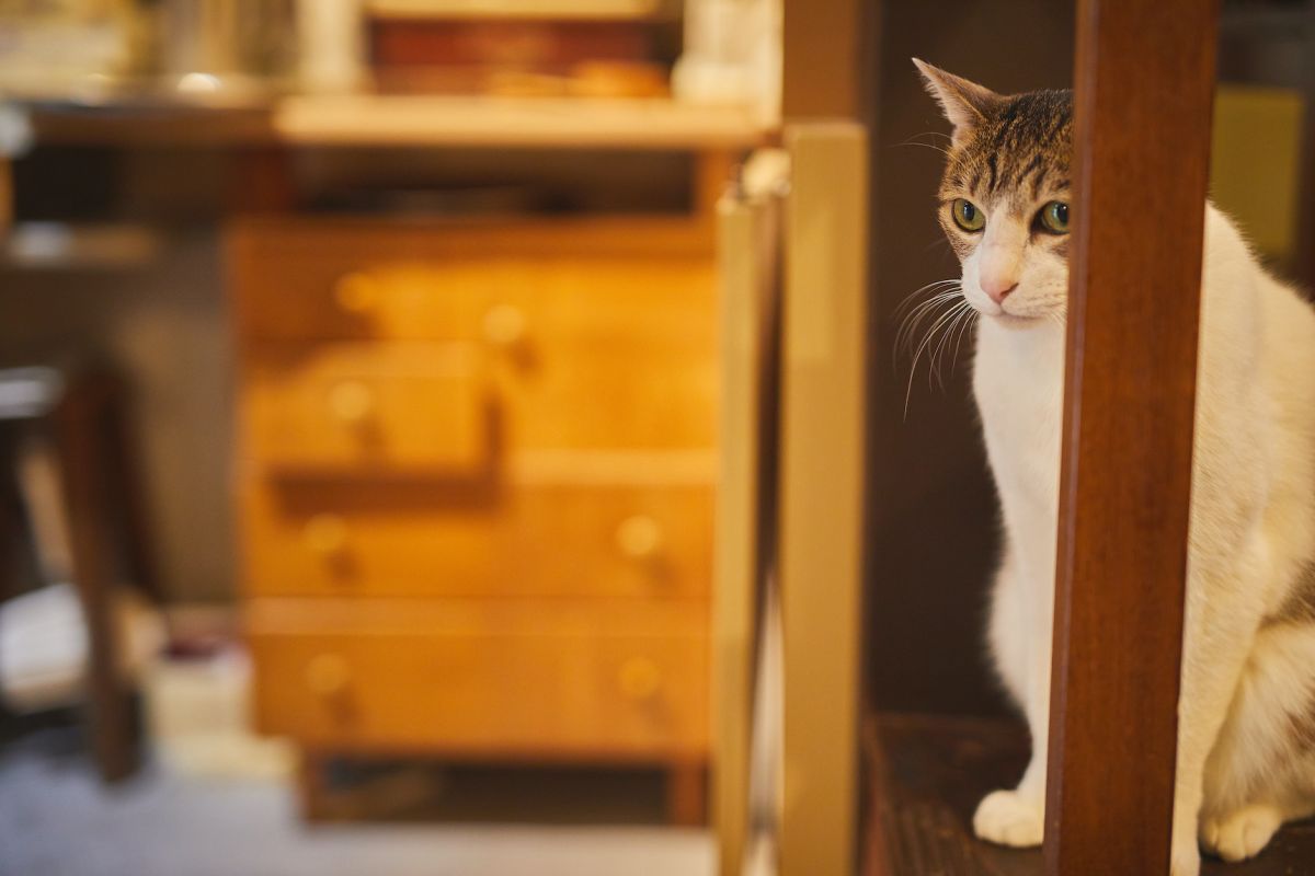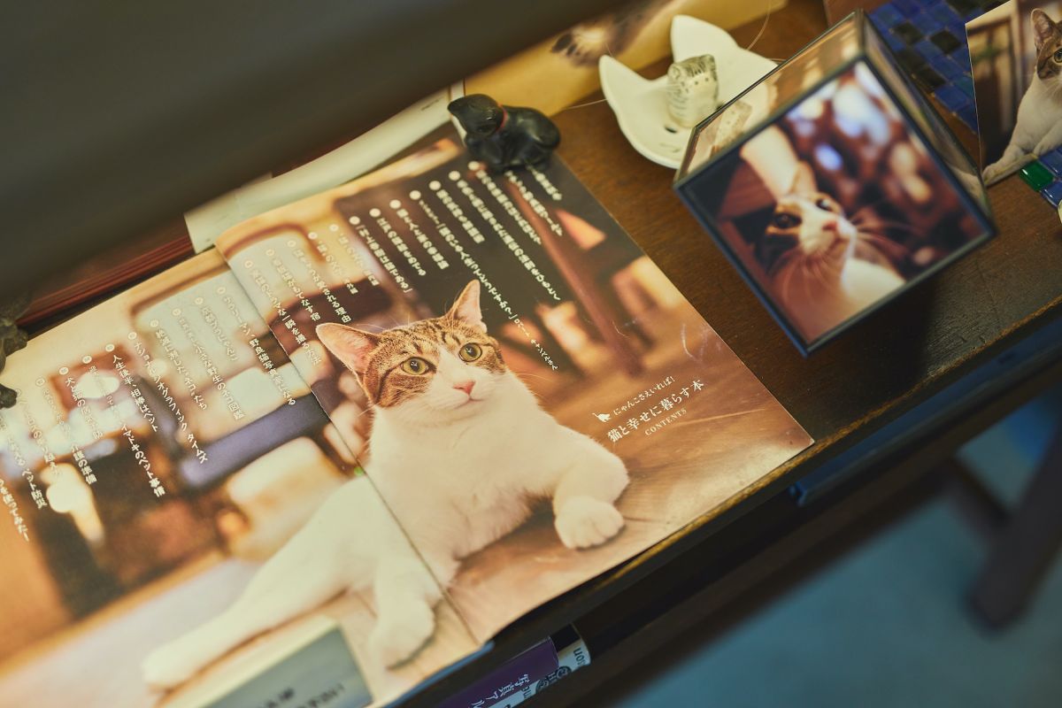 インテリアやショーケースの中に潜む、いくつもの猫モチーフの雑貨と猫の写真。