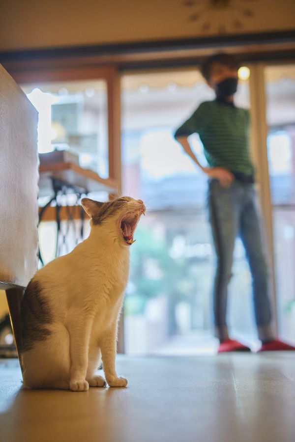 夕方くらいになるとふらりと降りてくることもあるそうですが、この日は、撮影のためにお願いして、連れてきていただきました。大あくび。(ごめんね……)