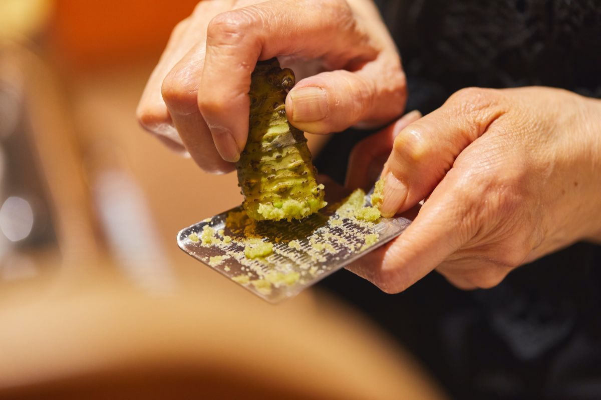 本わさび。チューブではなくて、ホンモノです。渓流や湿地に生育するあのわさびをすりおろして作ります。香りが命だから、すりおろすのは注文が入ってから!