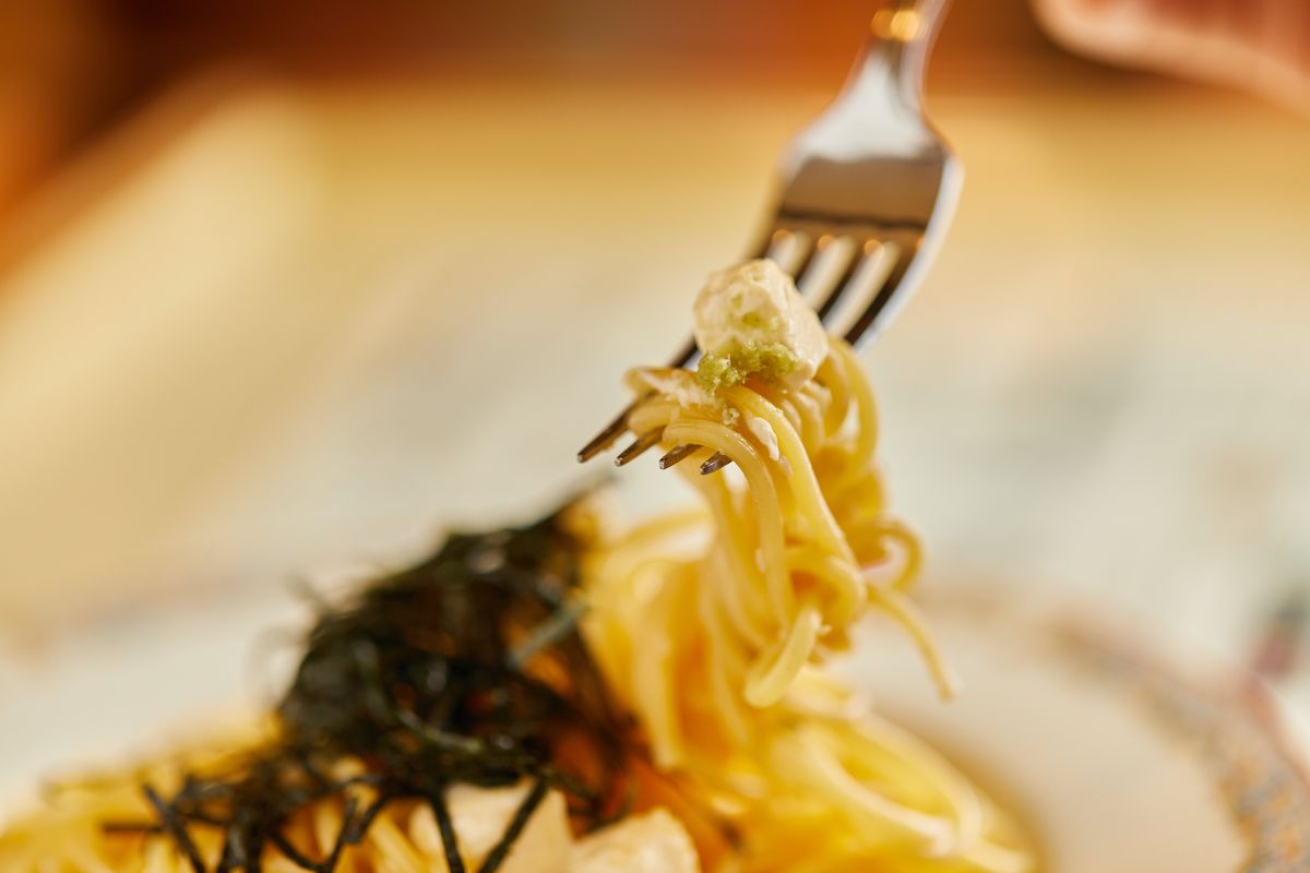 わさびとクリームチーズを一緒にくるくると巻き込んで口へ。ねっとりとしたクリームチーズが舌に膜を作ってくれますが、すりおろしたばかりのわさびは強烈な存在感。刺激のある味が好きな人にはかなりオススメ! 来るたびにこのパスタばかりを注文する人もいるそうです。