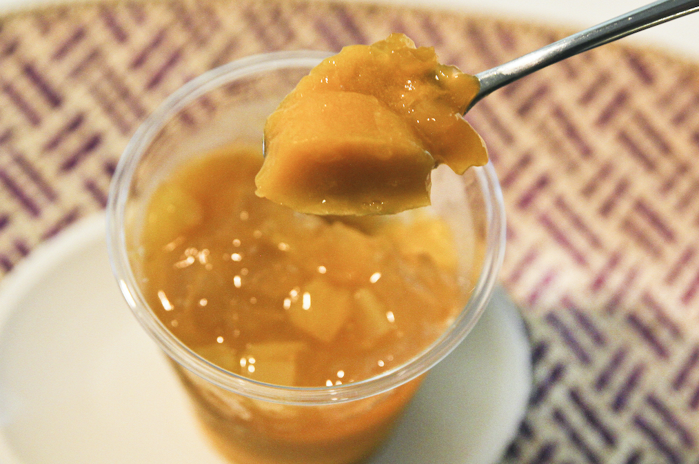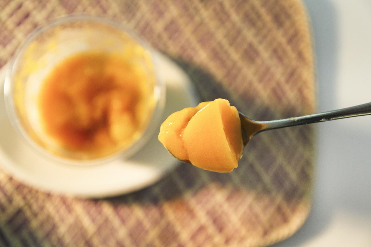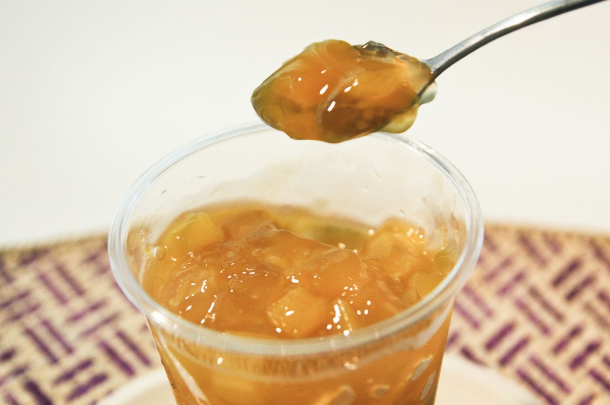 上層部を食べつつ、下方向にスプーンを進めるとマンゴープリンが登場します。下部のマンゴープリンは、上部とは打って変わって、やわらかくてねっとりとした舌ざわり。熟したマンゴーの甘みの中にある、少し発酵したような独特の酸味も再現されています。