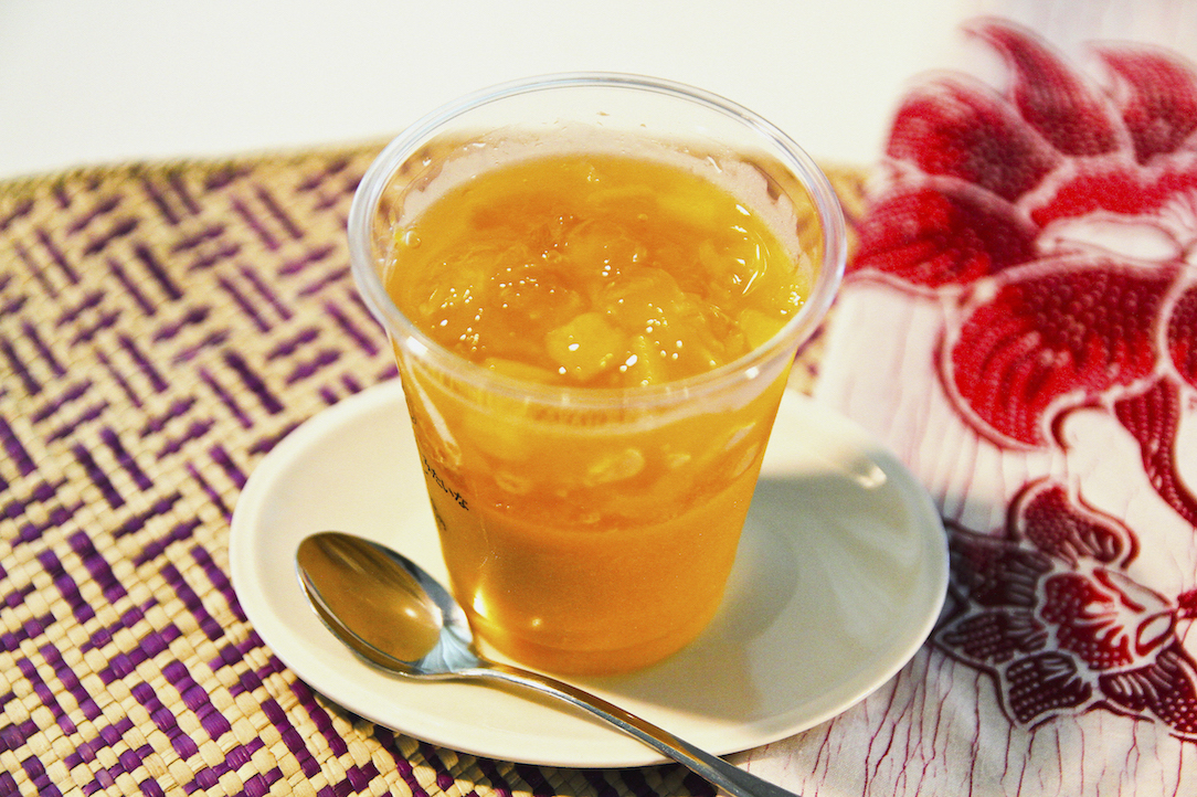 コンセプトにちなんで「涼」という文字が印象的な透明のカップに入っています。中は二層に分かれていて、鮮やかなオレンジ色。南国ムード全開のビジュアルで、思わず手に取りたくなります。