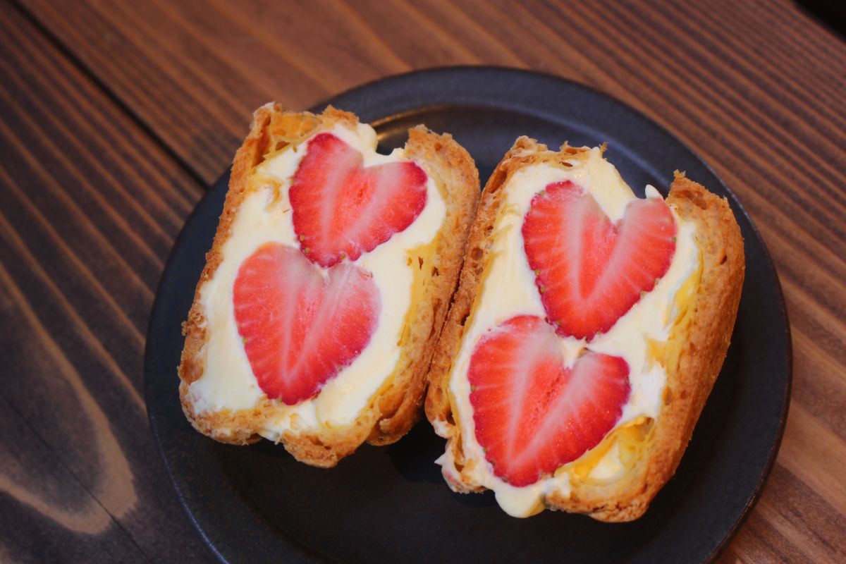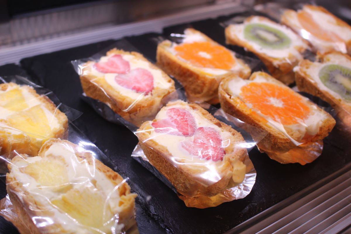 写真の「いちご」680円のほか、「黄桃」と「パイナップル」各630円、「キウイ」680円、「みかん」730円の5種類をラインナップ。黄桃とキウイ、みかんには生クリームにクリームチーズを加えたレアチーズケーキ風のクリーム、パイナップルといちごには生クリームにカスタードを合わせたオリジナルクリームを使っています。2個セットなので、友達とシェアして味わってみては?