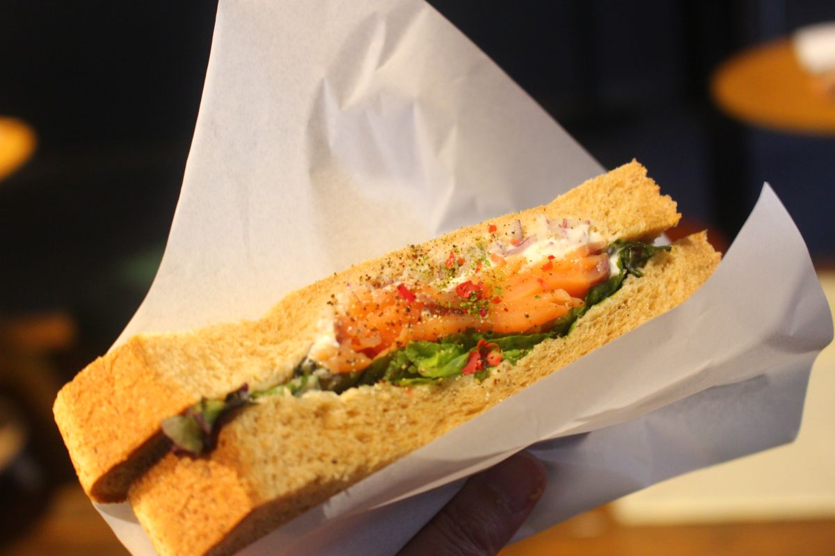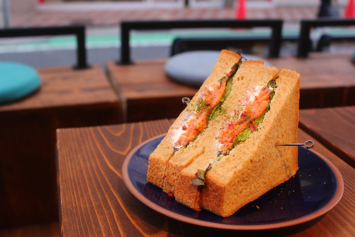 フードメニューでもう一つのおすすめは、食べごたえ満点のBIGサンド。全粒粉を使用したパンはあえて厚切りを使用し、具材もたっぷり。写真の「スモークサーモンサンド」1250円のほか、「パストラミサンド」1250円や「ヘルシーチキンサンド」1150円も人気だとか。フルーツシュークリーム同様にシェアして味わう人も多いそうです。